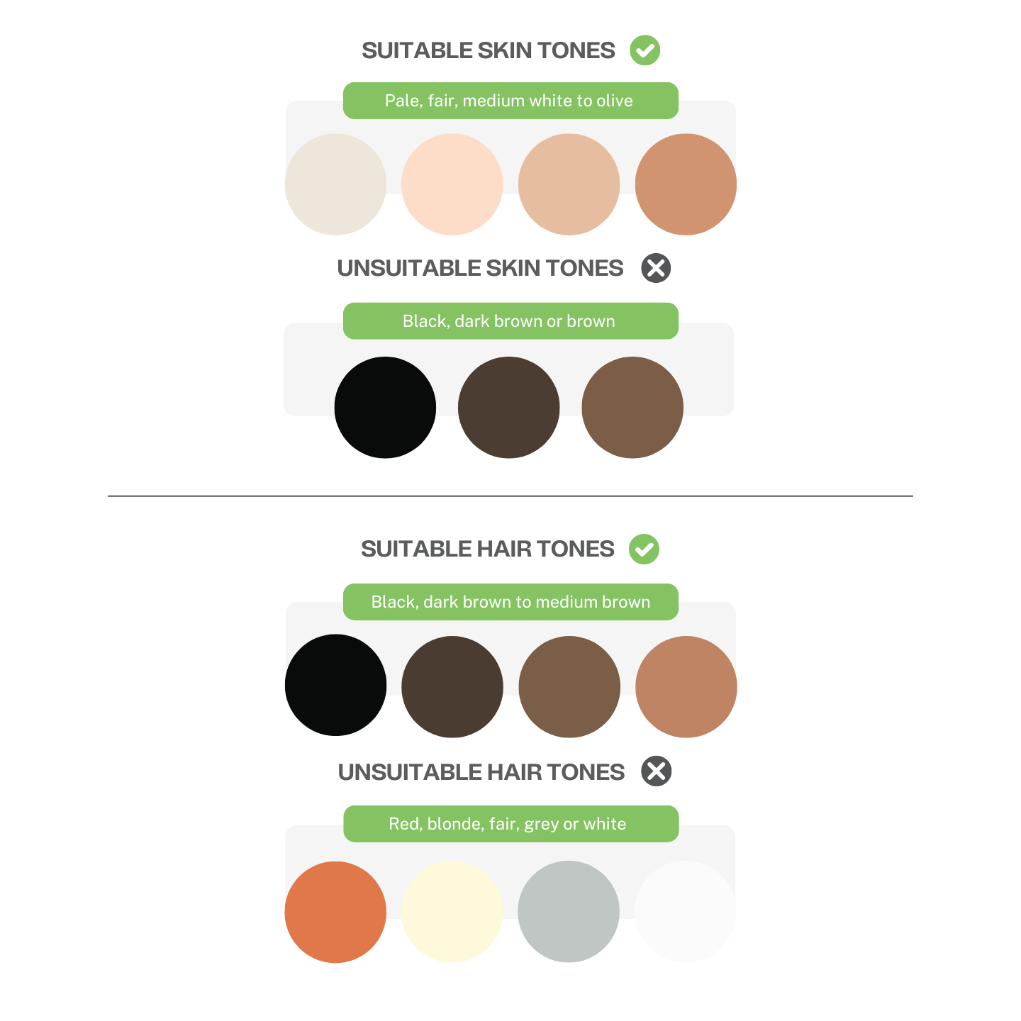 We can therefore only recommend its safe use for certain skin tones and hair colours. Use this chart as a guide but please note that this chart serves as a representation only and, due to varying screen colour renderings, the chart should not be used to determine suitability of the device.